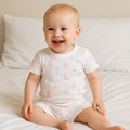 Hermoso Pijama corto de dos piezas 100% Algodón PIMA, diseñado en Chile y confeccionado en Perú con a más alta calidad del mercado, previene alergias, protege la delicada piel de tu bebe, entrega comodidad y suavidad.